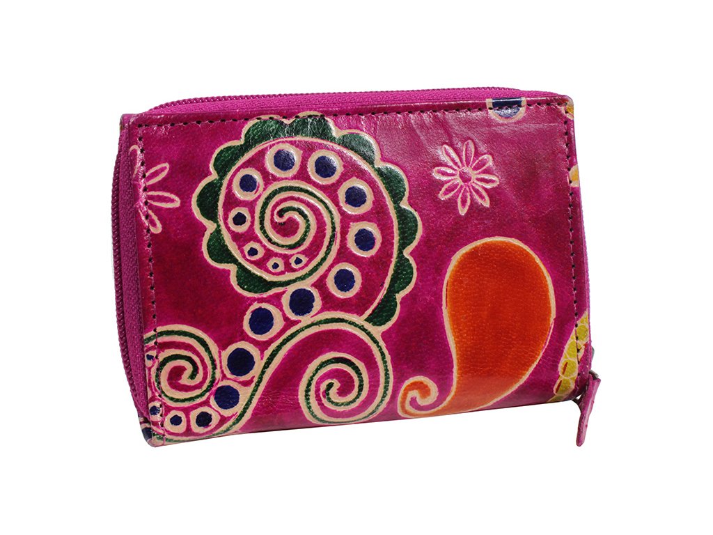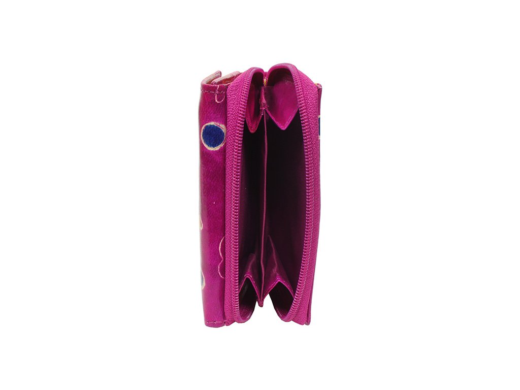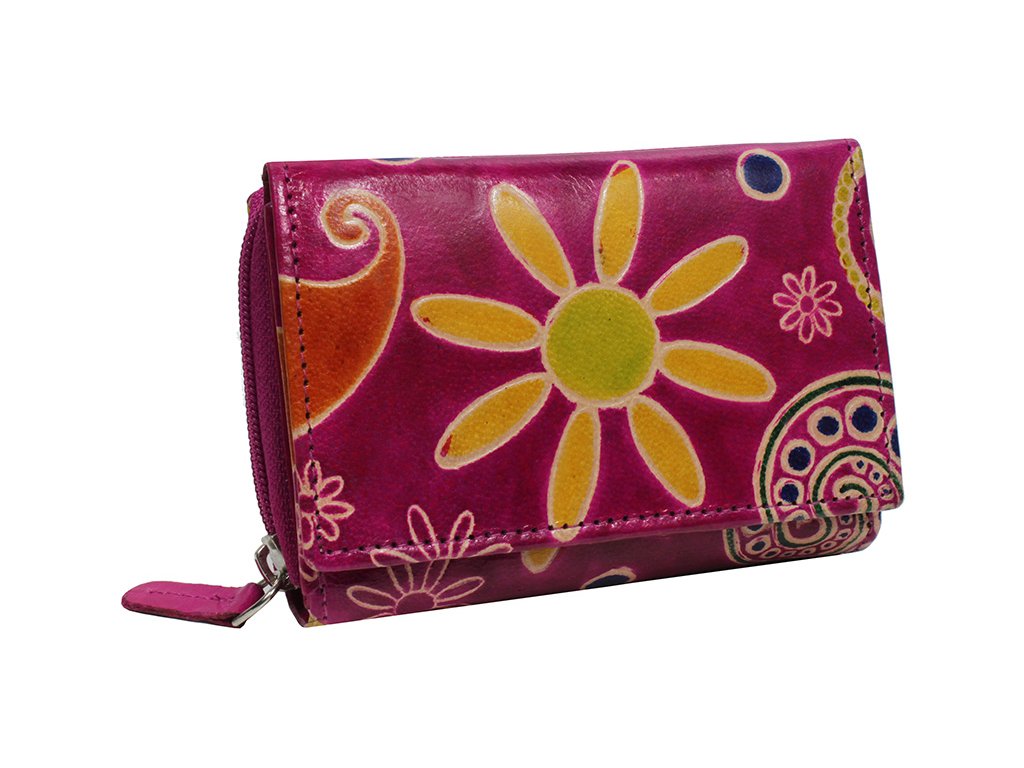 Dámská kožená peněženka vyrobená z kozí kůže, která je ručně malovaná. Kůže je na dotek tvrdší. Má zajímavý a neobyčejný design v růžové barvě s motivem květu. Peněženka má sedm přihrádek velikosti platební karty, z toho jedna přihrádka je s průhledným okénkem. Peněženka je střední velikosti s dostatečným prostorem pro karty, přitom si zachovává praktické rozměry. Přihráka na mince se zapíná na zip a je rozdělena přepážkou na dvě části.