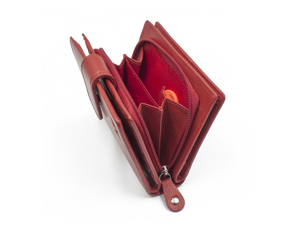 Dámská kožená peněženka velmi praktického provedení červené barvy. Je vyrobena z kvalitní měkké kůže, která je příjemná do ruky. Svými rozměry nezabere v kabelce mnoho místa, přesto disponuje dostatečným úložným prostorem pro platební karty a pojme i dva větší doklady (např. TP). Přihrádka na mince je na zip, uvnitř kapsička na žeton do nákupního vozíku. Velmi precizní zpracování z prvotřídní kůže ocení každý.