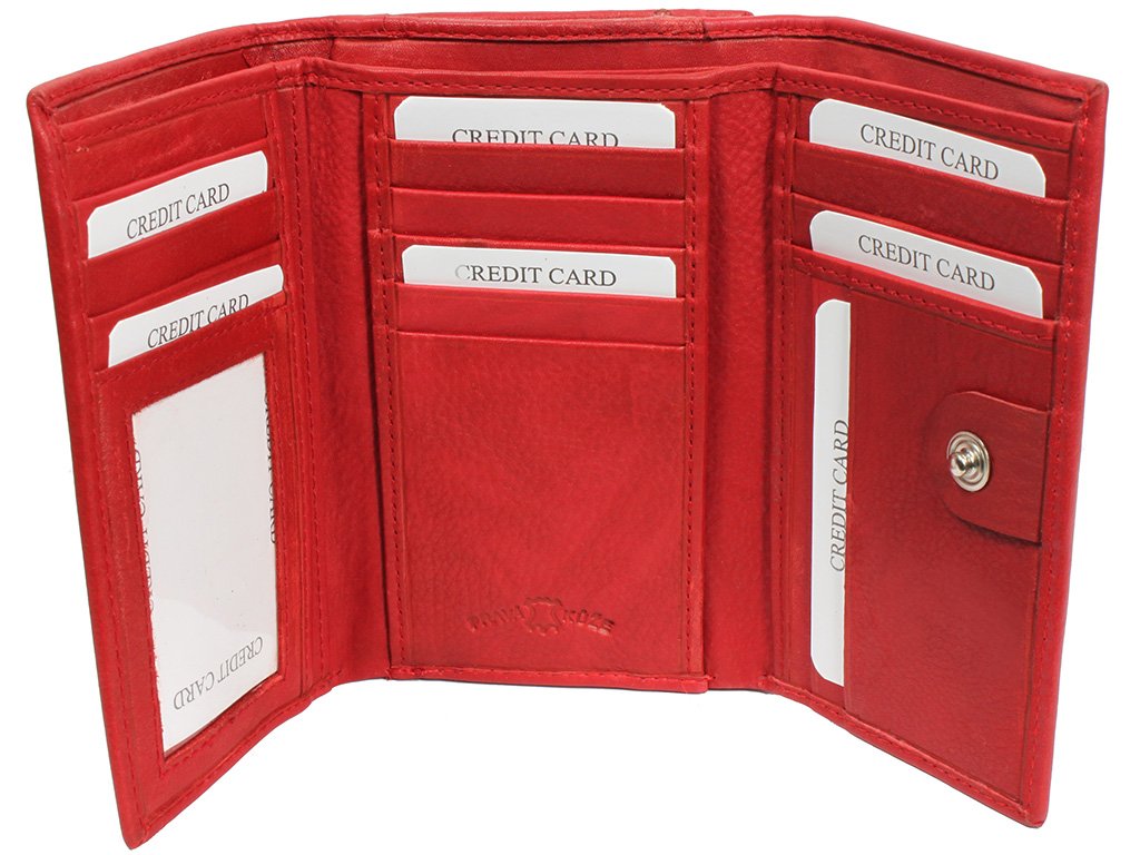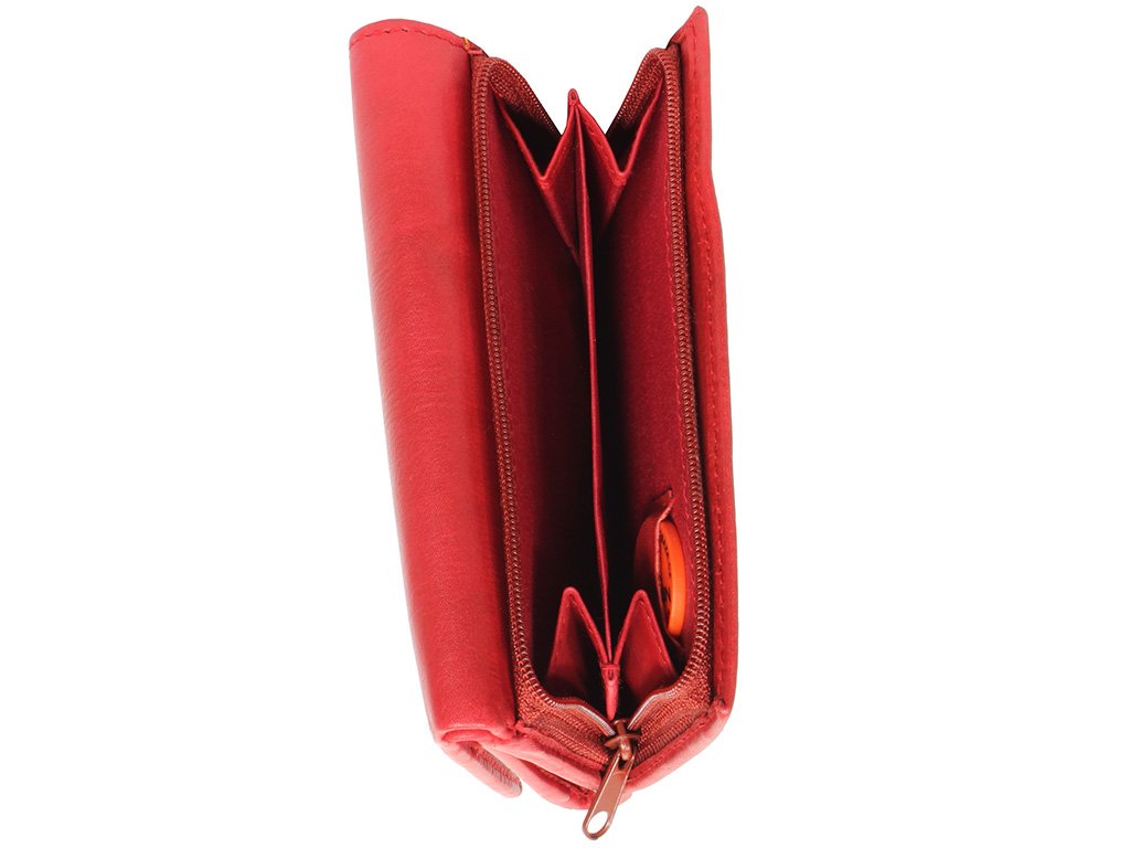 Praktická dámská kožená peněženka červené barvy s dvojím zapínáním. Je vyrobena z kvalitní měkké kůže, která je příjemná do ruky. Svými rozměry se jedná o peněženku střední velikosti, která poskytuje velký úložný prostor pro menší doklady a karty. Přihrádka na mince je na zip, uvnitř malá kapsička na žeton do nákupního vozíku.