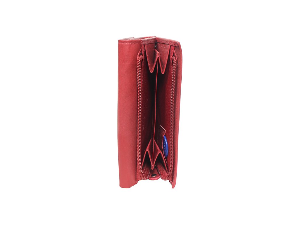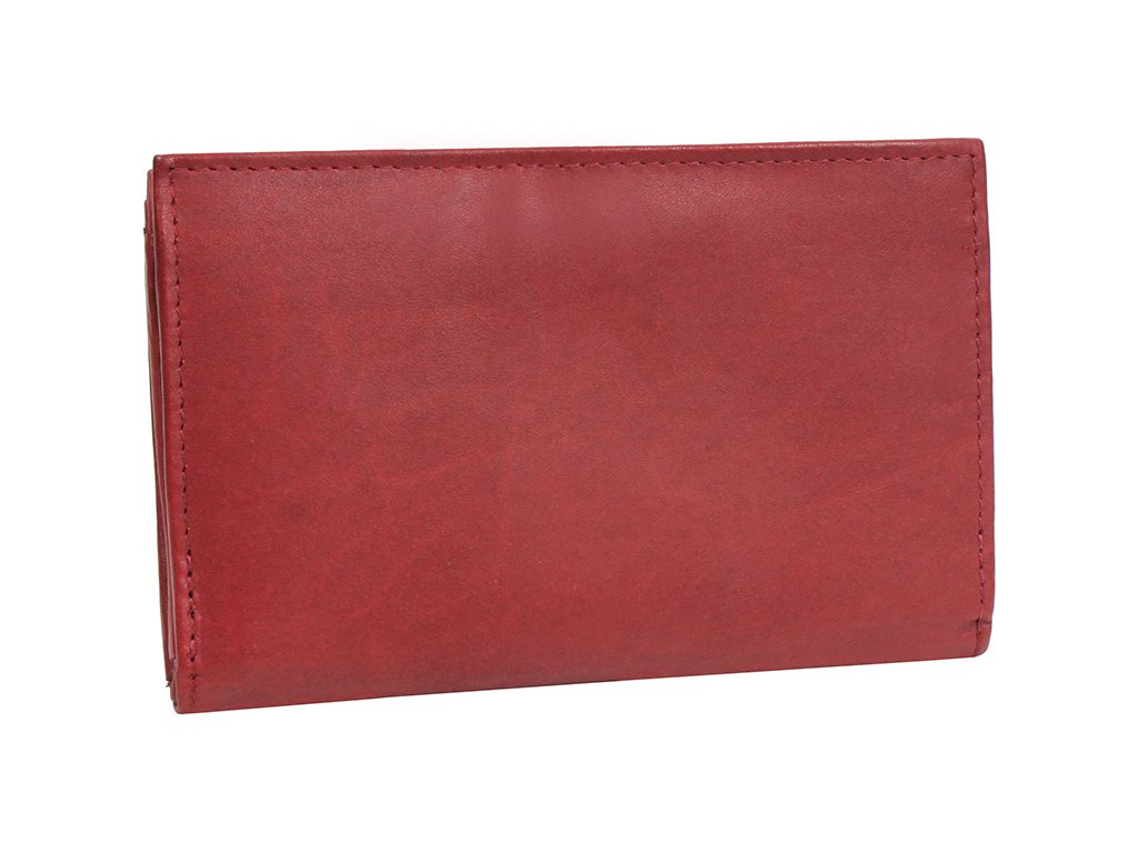 Cenově dostupná dámská kožená peněženka moderního designu a tmavě červené barvy. Peněženka má dvojí zapínání pro případ, že bude v peněžence více věcí. Svými rozměry se jedná o peněženku střední velikosti, která poskytuje velký úložný prostor pro menší doklady, na větší doklady přihrádky nemá. Přihrádka na mince je na zip a je rozdělena přepážkou na dvě části, uvnitř malá kapsička na žeton do nákupního vozíku.