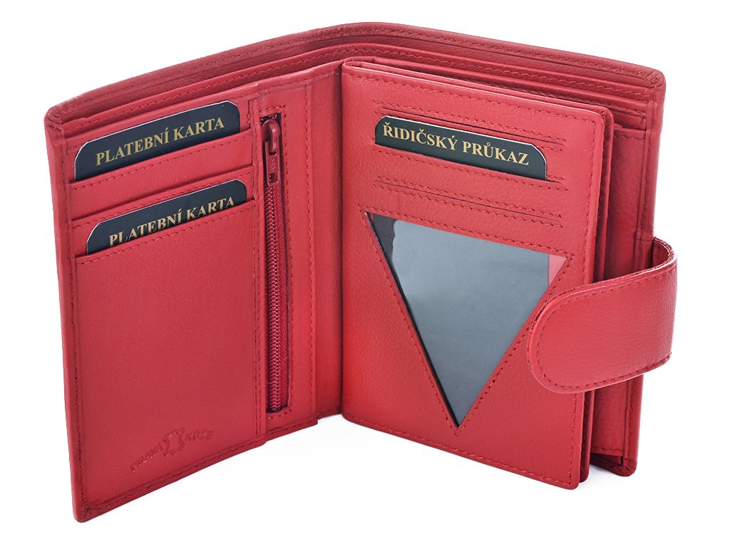 Praktická dámská peněženka z hovězí kůže v moderní červené barvě. Je vyrobena z kvalitní měkké kůže, která je příjemná do ruky. Peněženka je velmi prostorná, disponuje větším počtem přihrádek na větší i menší doklady, přesto si zachovává praktické rozměry. Z toho důvodu je také vybavena dvojím zapínáním, aby se dala peněženka bez problému zapnout. Přihrádka na mince je na druk. Velmi precizní zpracování z prvotřídní kůže ocení každý.