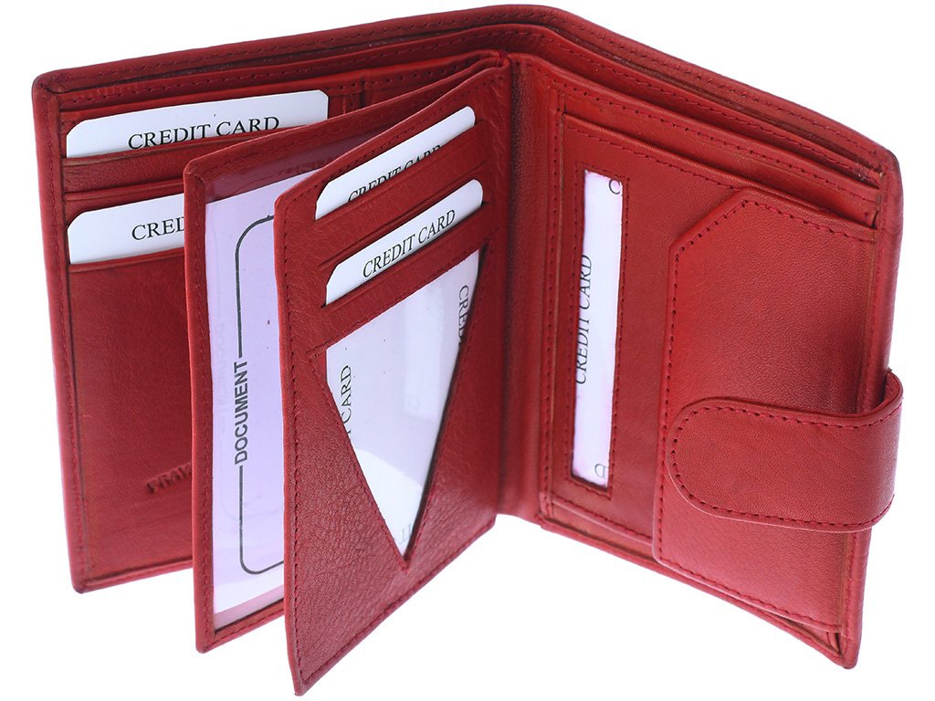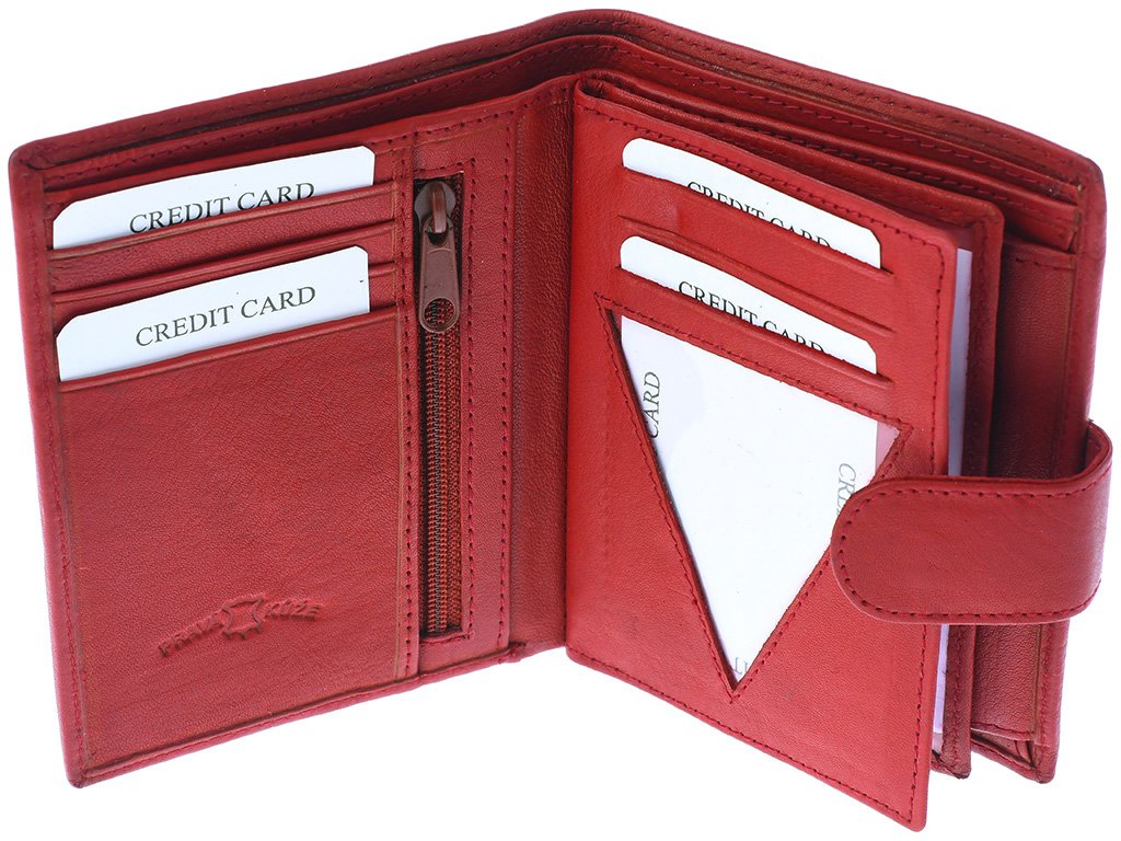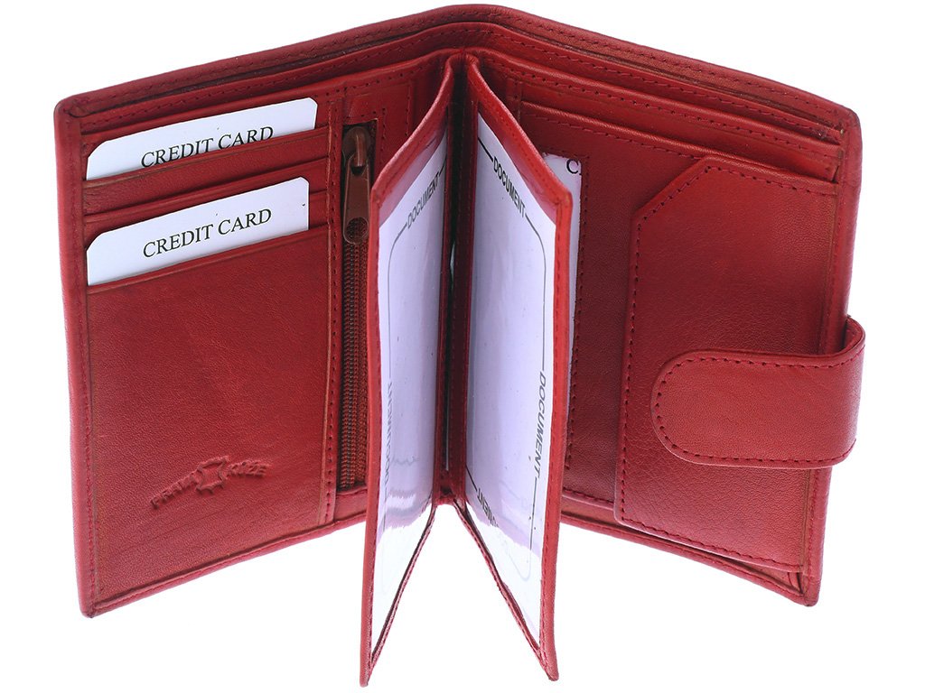 Praktická dámská peněženka z hovězí kůže v moderní červené barvě. Je vyrobena z kvalitní měkké kůže, která je příjemná do ruky. Peněženka je velmi prostorná, disponuje větším počtem přihrádek na větší i menší doklady, přesto si zachovává praktické rozměry. Z toho důvodu je také vybavena dvojím zapínáním, aby se dala peněženka bez problému zapnout. Přihrádka na mince je na druk.