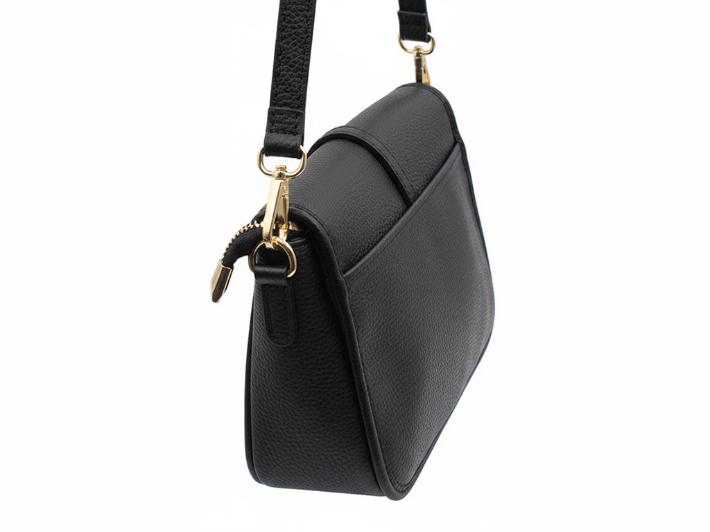 Elegantní kožená kabelka černé barvy z měkké kůže. Hlavní úložný prostor je jedna velká kapsa, uvnitř na zadní straně je k dispozici menší kapsička na zip. Ze zadní strany je kapsa např. na telefon. Popruh je nastavitelný, kabelku je možné nosit křížem nebo klasický přes rameno.