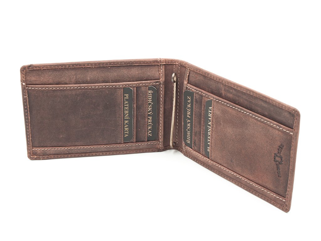 Velká dolarovka vybavená dostatečným počtem kapsiček na menší doklady, ale také doklady většího formátu, což nebývá standardem. Velmi precizní zpracování z prvotřídní broušené kůže ocení každý.
