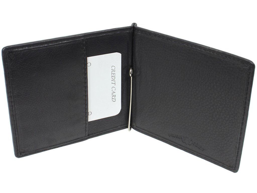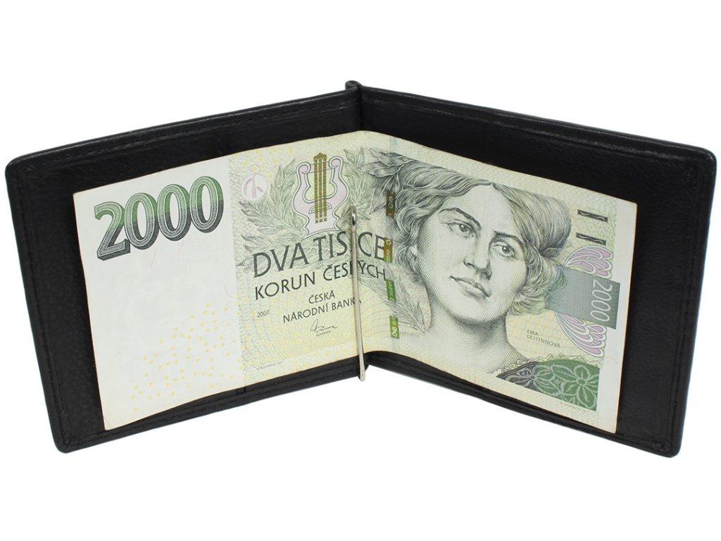 Kožená dolarovka klasického designu černé barvy. Je velmi jednoduše řešena, má jednu přihrádku velikosti platební karty. Kůže je měkká a příjemná na dotek. Nemá kapsičku na mince.