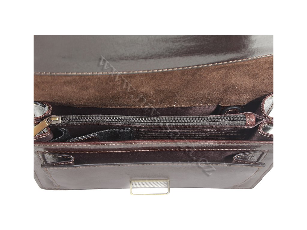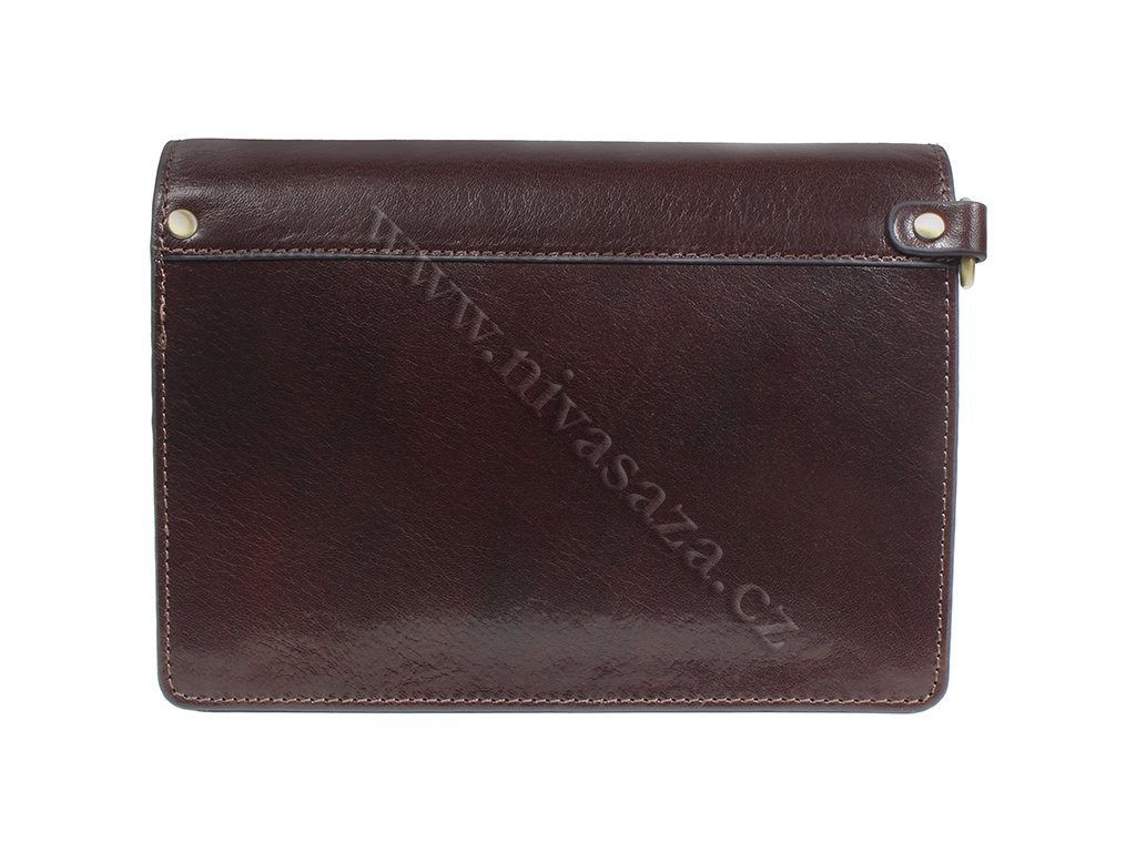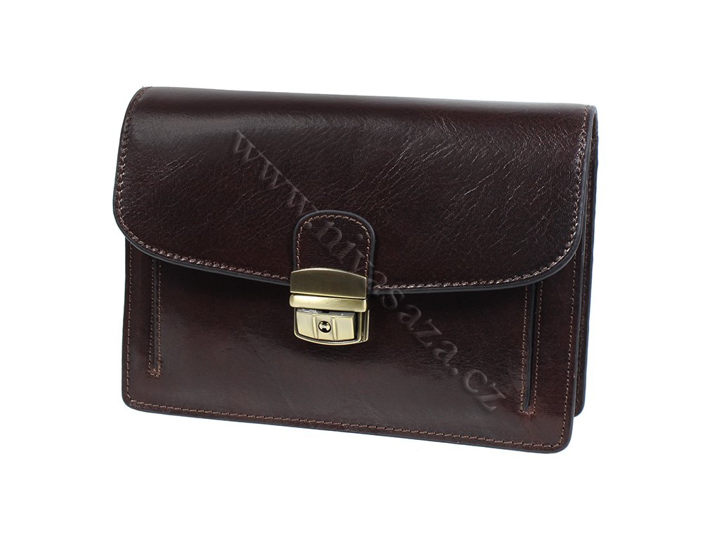 Prakticky a jednoduše řešená pánská kožená etue z hovězí kůže tmavě hnědé barvy. Etue má celkem 4 kapsy, z toho jedna je na zip. Má dvě hlavní kapsy rozdělené přihrádkou na zip. Jsou zde přihrádky na karty, na telefon a poutko na klíče. Dále je zde další kapsa, spíše na drobnosti. Kování je mosazné, nechybí poutko do ruky, které je také kožené. Kůže má lesklou povrchovou úpravu.