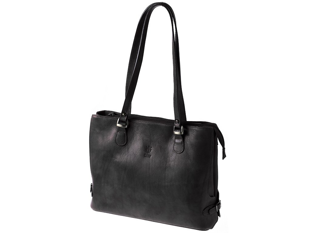 Kvalitně zpracovaná praktická kabelka černé barvy, vhodná na každodenní nošení. Je velice prostorná. Její obsah se skládá z hlavního úložného prostoru, který je rozdělený na dvě části kapsou na zip. Dále nechybí jedna přihrádka pro drobné věci, která je uzavíratelná na zip a dvě menší, které nejsou uzavíratelný(například na telefon). Ze zadní strany naleznete ještě kapsu na zip. Kabelka má uši přizpůsobeny na nošení jak v ruce, tak i přes rameno, které nelze nastavit. Na vrchní části jsou magnety, které slouží pro rozšíření kabelky a na spodní části jsou designové přezky. Zcela bez problému se vejde formát A4.