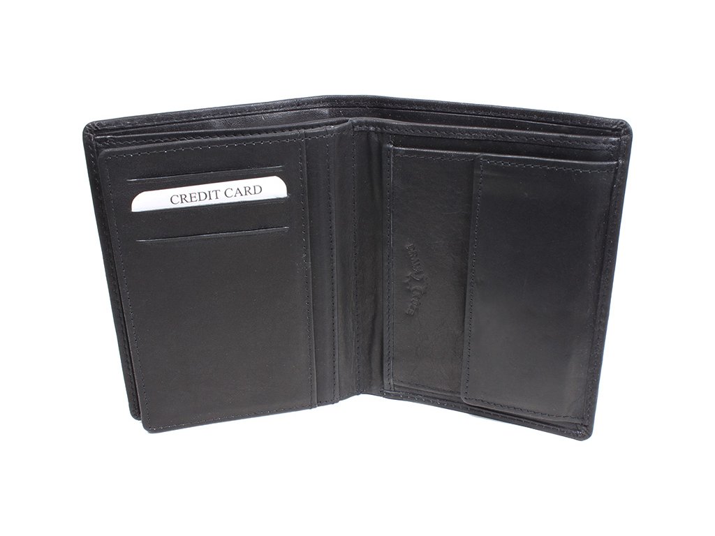 Pánská kožená peněženka klasickho designu černé barvy, orientovaná na výšku. K dispozici je velký úložný prostor pro doklady - větší (TP) i menší (velikost platební karty). Přihrádka na mince se zapíná na patent, uvnitř je malá kapsička na žeton do nákupního vozíku.