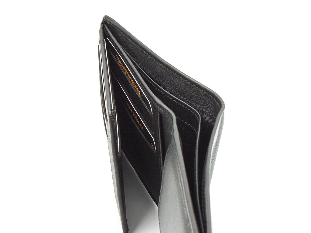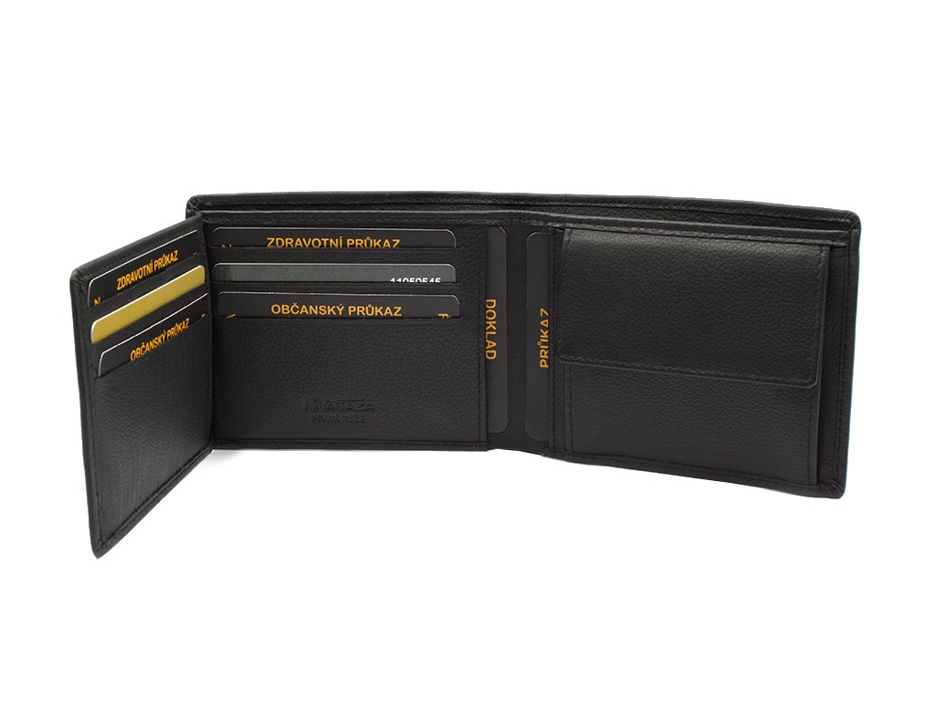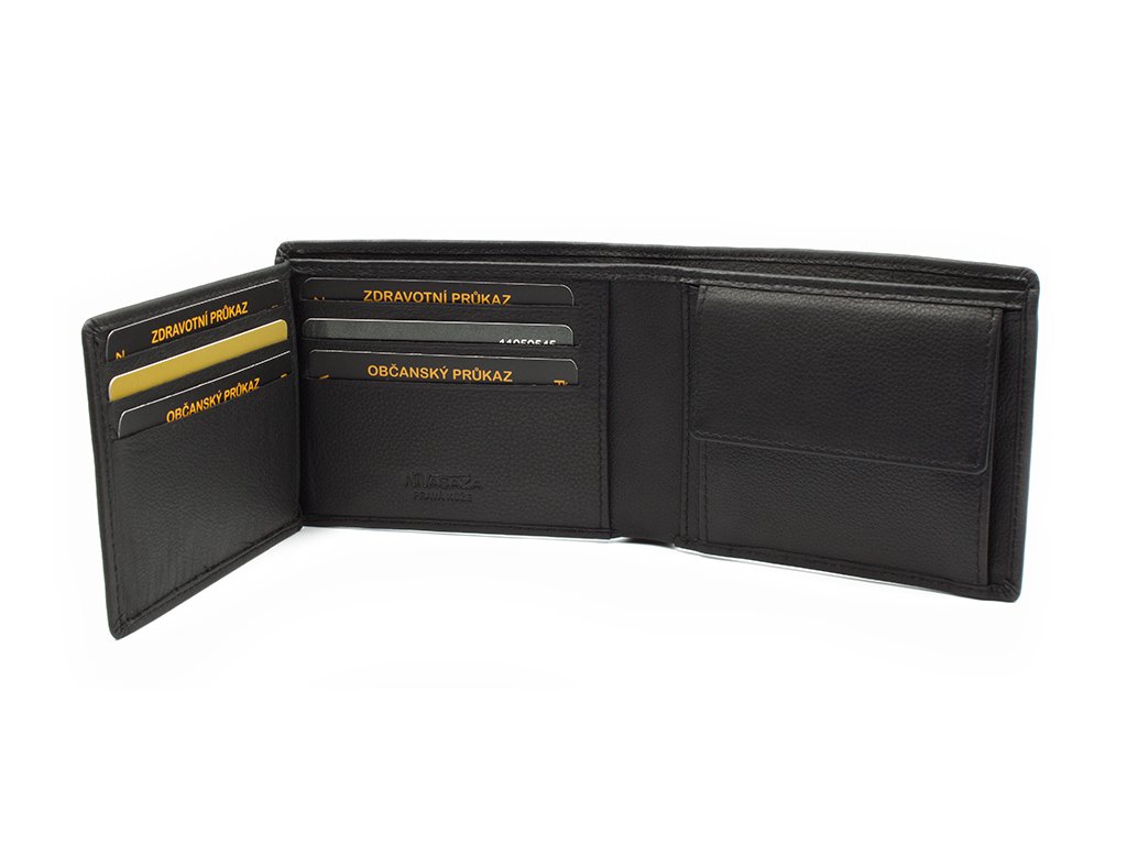 Kvalitní pánská kožená peněženka středních rozměrů černé barvy. Má dostatek přihrádek velikosti platební karty, přitom si zachovává praktické rozměry. Velikost nahrává dokladům menších rozměrů, ale s odřenýma ušima se vejde i např. malý TP. Přihrádka na mince je na druk, uvnitř kapsička na žeton do nákupního vozíku.