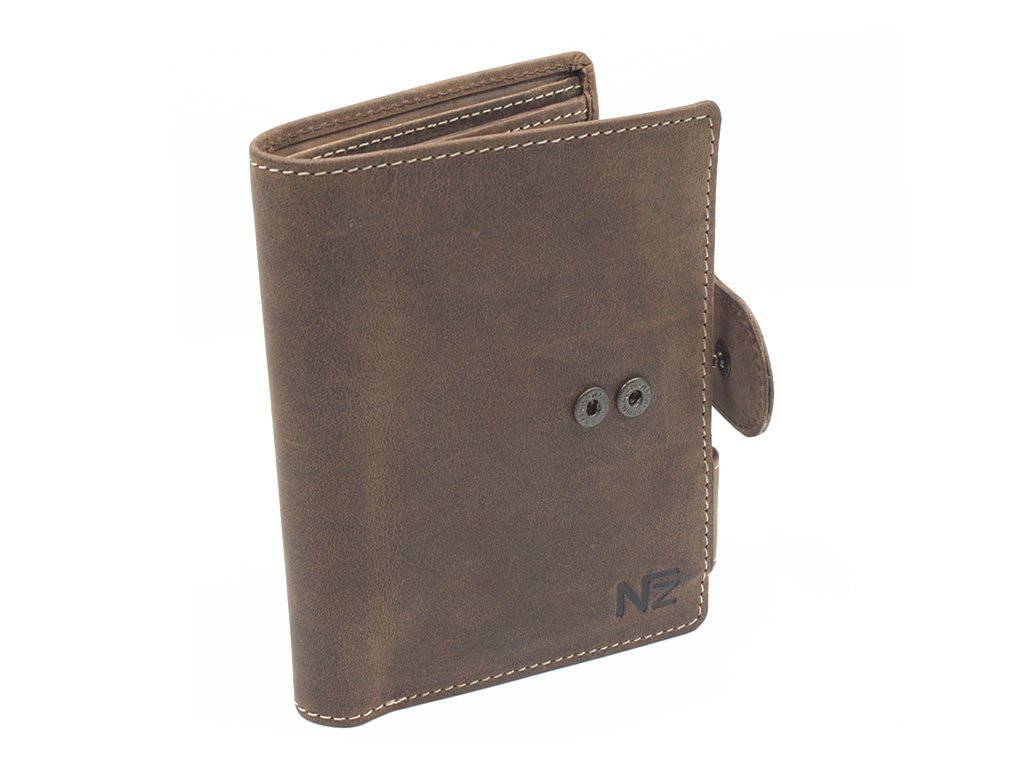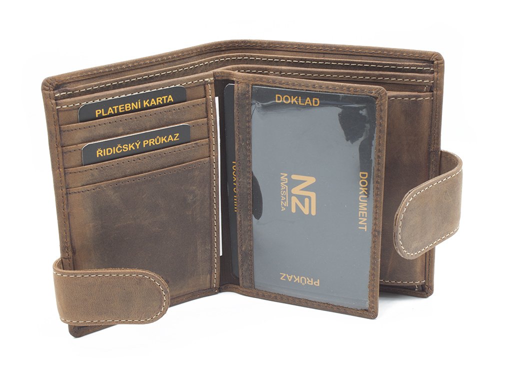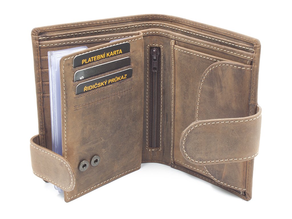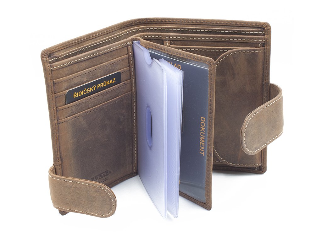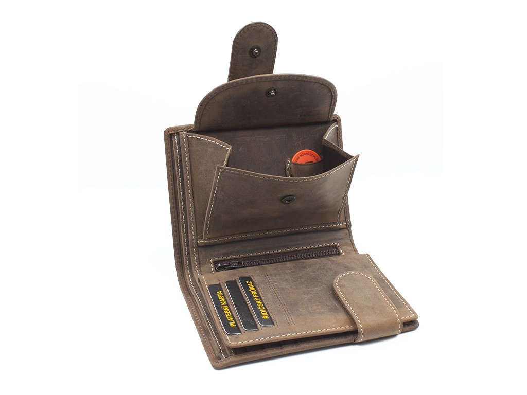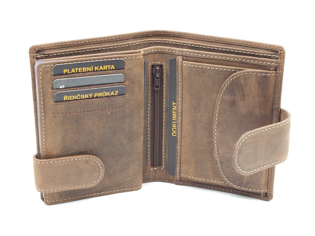 Kvalitní pánská kožená peněženka vyrobená z prvotřídní hovězí kůže tzv. broušená kůže. Peněženka je orientována na výšku se zapínáním. Pokud nosíte dokladů více, je vybavena dvojím zapínáním, takže ji bez problému zapnete. Poskytuje dostatek místa pro větší i menší doklady, výhodou této peněženky je, že dokladovou plastovou vložku je možné vyndat v případě menšího počtu dokladů. Plastová vložka obsahuje otvory a výřez u horní hrany pro snadnější manipulaci. Přihrádka na mince se zapíná na druk, uvnitř je zvláštní kapsička na žeton do nákupního košíku.