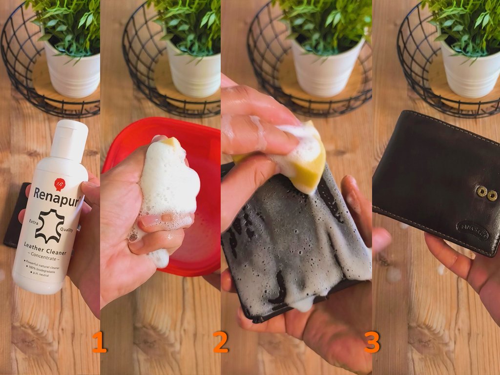 K aplikaci výše, jedná se o obecný návod pro celou řadu kožených produktů, bod č. 1 a částečně 3, většinou lze vynechat. Je třeba vzít v úvahu, že peněženka, taška zpravidla nebudou mít takovou špínu jako např. boty. Navlhčit, aby bahno "změklo", čistit a pak vyplachovat, v tomto případě nemá smysl. Stačí pěna, lehce kroužit houbičkou a pak vlhkou vyždímanou houbičkou setřít.