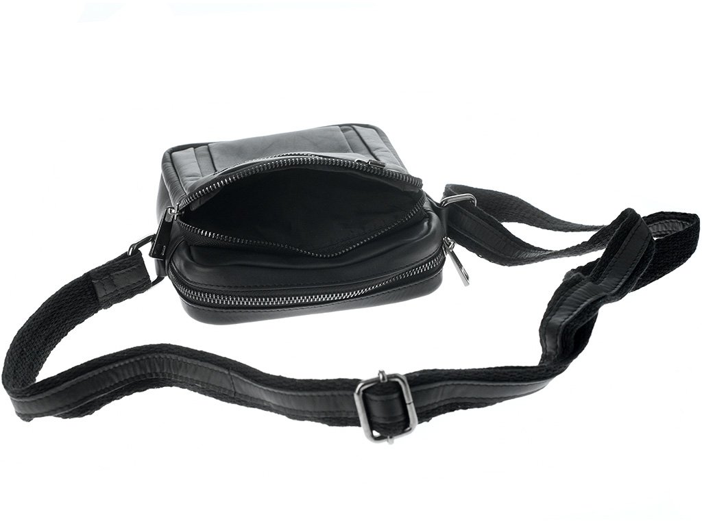 Kvalitní pánská taška klasického designu v černém provedení. Taška je celokožená a má dlouhé nastavitelné ucho přes rameno, které je v kombinaci kůže a látky (bavlna). Hlavní kapsa se zapíná na zip, uvnitř je další menší kapsa na zip a přihrádka na telefon. Z čelní strany jsou další dvě kapsy, obě se zapínají na zip a jsou spíše na drobnosti. Vzadu kapsa na magnet.